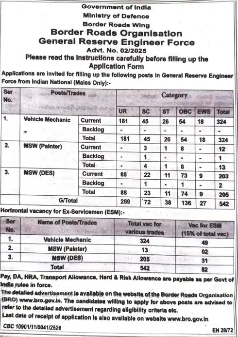 BRO MSW and Vehicle Mechanic Recruitment 2025: Border Roads Organization (BRO) की तरफ से हाल ही में एक अधिसूचना जारी हुई है। इस अधिसूचना में Border Roads Organization (BRO) के जनरल रिजर्व इंजीनियर फोर्स (GREF) के लिए कुल 542 पदों पर आवेदन मांगे हैं। यह पद Vehicle Mechanic, Multi-Skilled Worker (MSW) Painter और DES के लिए भरे जाएगें। इन पदों के लिए 11 अक्टूबर 2025 से आवेदन भी शुरू हो गए हैं।